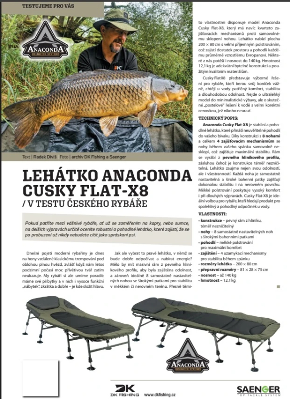 Od roku 2001 je značka Anaconda synonymem pro kvalitní rybářské vybavení, které splňuje nejnáročnější požadavky moderní kaprařiny. Naše lehátka jsou navržena s důrazem na odolnost, stabilitu a maximální pohodlí. Cusky Flat - X8 je dokonalou volbou pro rybáře, kteří hledají nejen funkčnost, ale i výjimečný komfort pro odpočinek u vody.