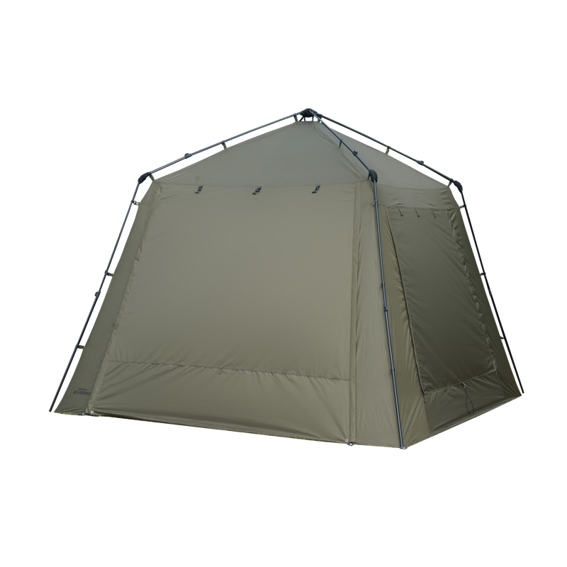 Přístřešek je vyroben z 210D polyesteru s PU zátěrem a vodním sloupcem 8 000 mm, což zajišťuje vynikající ochranu proti dešti. Součástí je také sada tyčí pro vytvoření prodloužené přední stříšky, přední dveře lze použít s plným zeleným panelem nebo s moskytiérovou síťkou a dvě velká boční větrací okna umožňují přizpůsobitelné proudění vzduchu.