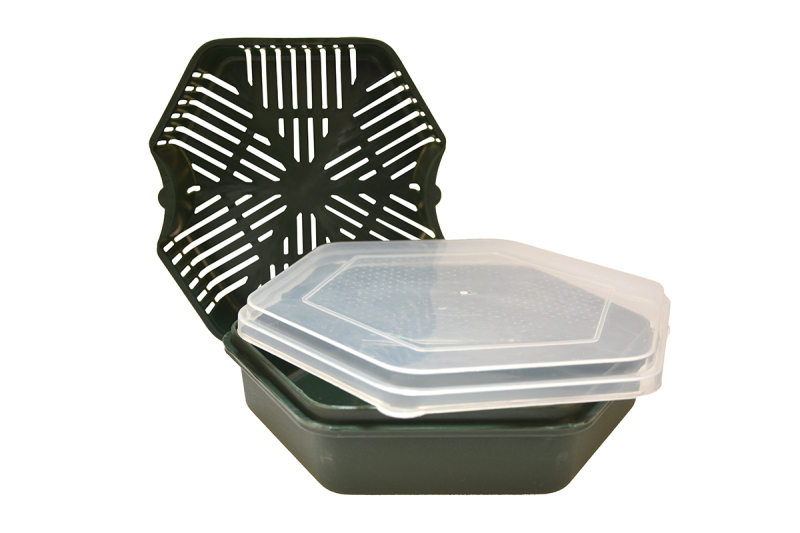Šestihranná krabička na nástrahy s průhledným víkem a odkapávací miskou, která se perfektně vejde do boxu.