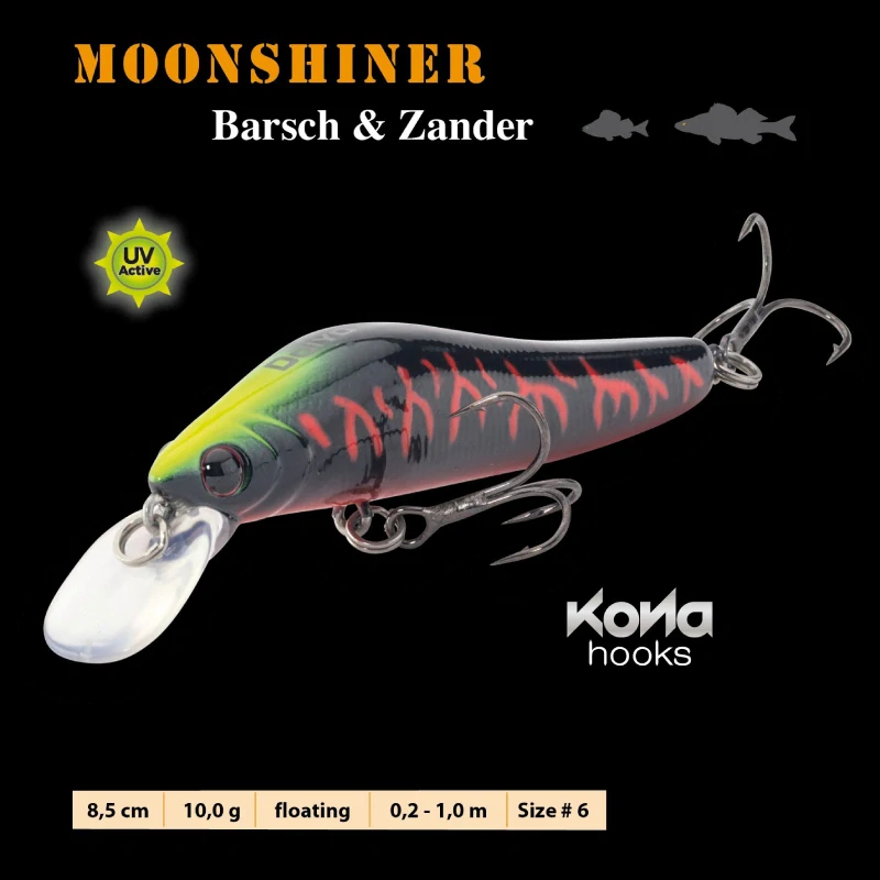 Model Moonshiner Z se velmi dobře uplatní zejména při lovu za šera, v noci nebo při vedení podél kamenných břehů. Syté UV aktivní barvy zvyšují nápadnost nástrahy a rozšiřují možnosti jejího použití právě v horších světelných podmínkách. Wobler tak představuje velmi zajímavou volbu pro cílený lov dravců v mělčích úsecích vody, kde je důležitý jemný projev i spolehlivá viditelnost nástrahy.