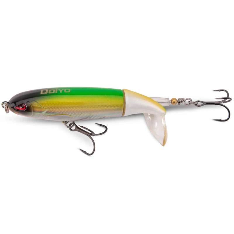Doiyo Concept Pulldawg Hecht & Rapfen je výrazný hladinový wobler navržený pro cílený lov štik a bolenů. Při vedení po hladině pracuje se zadní rotující vrtulkou, která vytváří silný rozruch, hluk a nápadnou stopu na hladině. Právě tato kombinace akustického a vizuálního efektu dokáže účinně vyprovokovat útok i od aktivně lovících dravců.