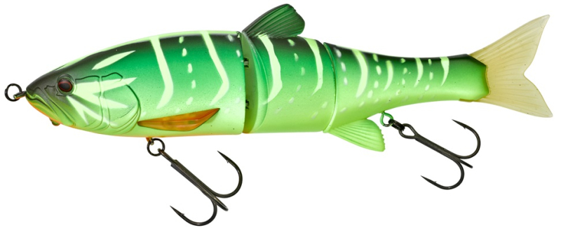 Trojdílná nástraha pro lov štik. Při klasickém tažení má dokonalou S akci imitující přirozený pohyb rybičky. Tu ještě můžete oživit jerkováním špičkou prutu. Ideální pro lov v mělkých zátokách a lov kolem břehu. Pod hlavou očko pro uchycení přídavné zátěže. Háčky na vsazených obratlících pro minimální ztrátovost ryb při zdolávání. Některé barvy obsahují UV body. Délka 18 cm, váha 54,5 g, potápivost 0,05-1 m, plovoucí nástraha.