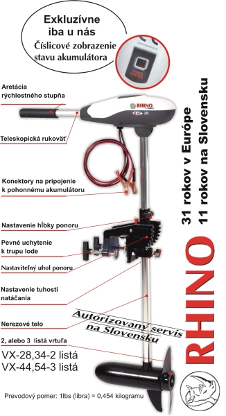 Charakteristika: Silný, silnější, Rhino VX. Jeden z nejsilnějších závěsných lodních elektromotorů na trhu. Rhino VX se vyznačuje nízkou spotřebou energie, což umožňuje delší manipulační čas. Motor se řídí a ovládá teleskopickou rukojetí a má 5 rychlostí vpřed a 2 vzad. Motor může být jednoduše vyklopený z vody stiskem tlačítka. Hloubka ponoru vrtule a tuhost řízení jsou plynule nastavitelné. S číslicovou indikací stavu akumulátoru snadno odhadnete svůj dojezd. Rhino VX poskytuje jednoduché, komfortní a bezpečné ovládání. Vhodné pro všechny běžné a rekreační plavidla.