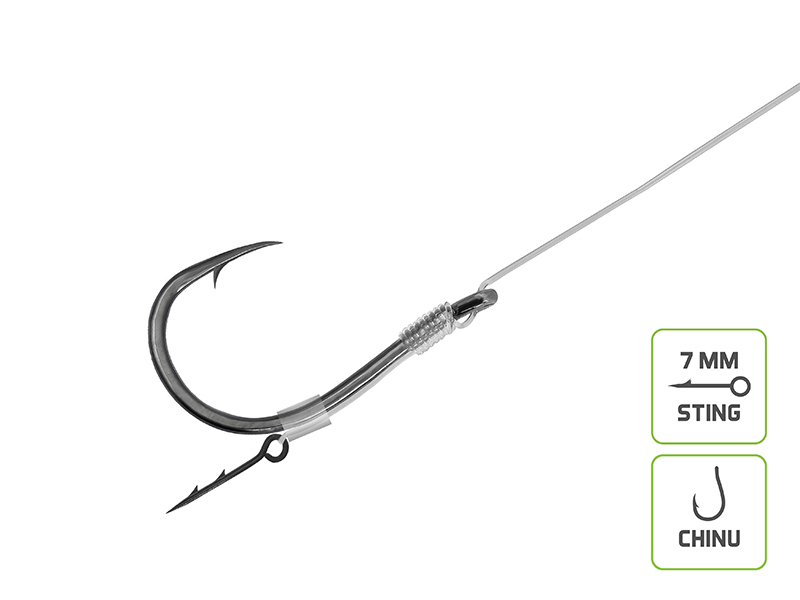 Návazec je zhotoven z kvalitního fluorokarbonu, který je pod vodní hladinou pro ryby téměř neviditelný. Kromě nenápadnosti vyniká i vysokou odolností vůči oděru, což z něj činí spolehlivou volbu i při lovu v blízkosti překážek či na tvrdém dně. O spolehlivý zásek se starají ověřené modely háčků Turner a Chinu. Jejich specifický tvar a výjimečná ostrost zaručují bezpečné zdolávání a minimalizují riziko ztráty ryby během souboje.