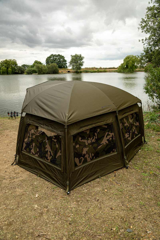 Frontier II - X Deluxe WrapPřehoz Deluxe Wrap prodlužuje váš bivak o 60cm, nabízí tak větší ochranu a v kombinaci s připojením předním panele dostatek místa pro dvě lehátka. Kompletního zakrytí se dosáhne odepnutím předního panelu z bivaku a jeho připnutím na přehoz. Pro dosažení optimálního proudění vzduchu jsou čtyři větrací otvory s dvojitými zipy zarovnané s větracími otvory na bivaku, zatímco přes spojky připojené podpěrné tyče přidávají rozšiřujícímu žebru rámu na stabilitě. Snadno se zajišťuje s pomocí pásků na suchý zip a D-oček. V nabídce v zeleném i camo provedení
