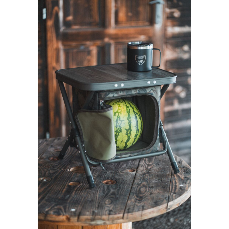 Praktický skládací stolek s integrovanou taškou na uložení různých věcí, který se skvěle hodí do vašeho bivaku či brolly.