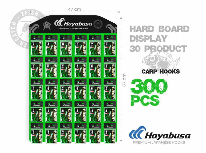 Ideálním pomocník pro dokonalou prezentaci kompletního sortimentu prémiových teflonových kaprových háčků japonské výroby. Kvalita materiálu a zpracování těchto plat spolu s elegantním designem zajistí, že se na Vaší prodejně rozhodně neztratí a jsme si jistí, že neunikne pozornosti žádného zákazníka. Plato disponuje velkou plochou k zavěšení produktů na prodejní háčky. Součástí balení těchto plat jsou samozřejmě i samotné závěsné háčky a to v počtu 30 ks