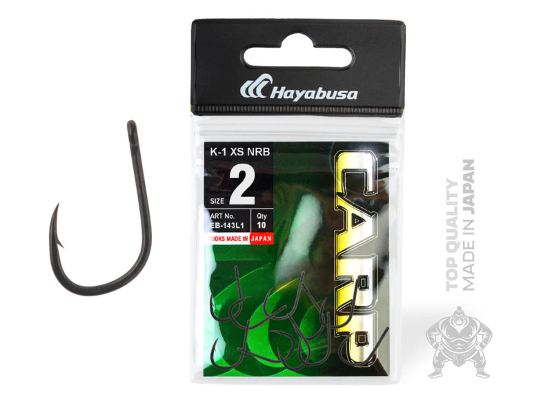 Háček Hayabusa K-1 XS s širokým obloukem a se zesíleným drátem – extrémně odolný háček pro těžké podmínky a lov velkých kaprů. Zvětšuje dosah při záběru a zajišťuje jisté zaseknutí i v hustší vegetaci nebo ztížených podmínkách. Skvěle se hodí pro lov kaprů na boilies a pelety, ale i pro použití s většími měkkými nástrahami. Jsou vhodné jak pro klasické kaprové montáže, tak i pro moderní prezentace nástrah.
