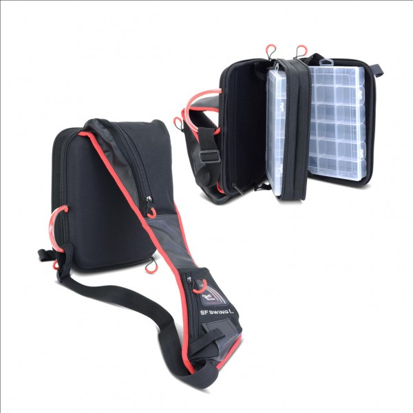 SF Swing L je určena pro výpravy na dlouhé vzdálenosti. Kromě dvou hlavních kapes na plastové boxy, které jsou zajištěny pomocí suchého zipu proti pádu, má taška 2 úložné prostory pro příslušenství a držák kleští na postroji. Všechny zipy jsou zakončeny extra silnými smyčkami, které umožňují snadné otevírání dokonce i v rukavicích nebo s mokrýma rukama. Taška je zavěšená v oblasti břicha, takže se do ní snadno dostaneme.