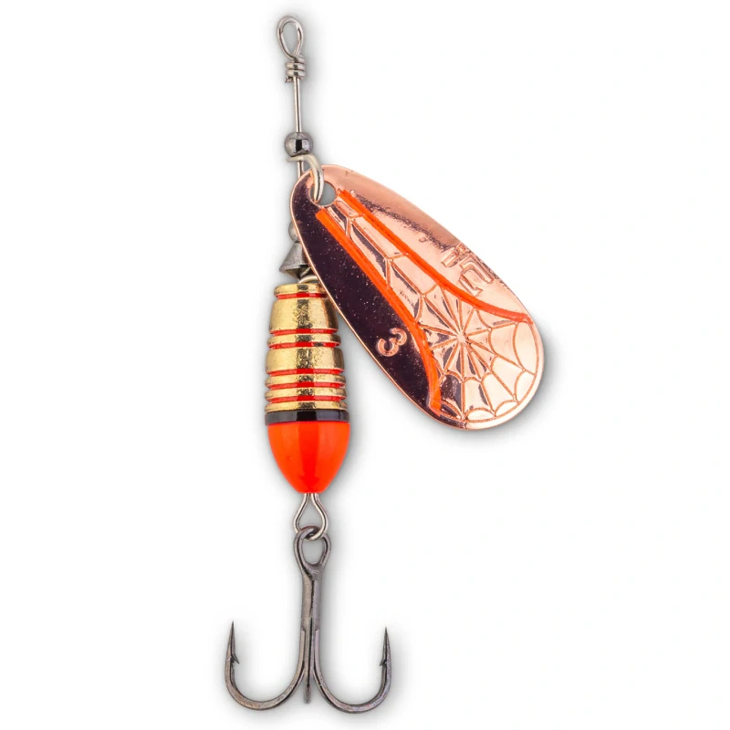 Crack Blade Spinner je postavený na mosazném těle a mosazném rotačním listu, což přináší výborné letové vlastnosti a přesné nahození. Při vedení vytváří výraznou tlakovou vlnu a současně vrací odlesky z různých úhlů, takže zůstává dobře čitelný i v proměnlivém světle. Rotační list se rozbíhá už při minimálním tahu, a třpytka je proto účinná i při pomalém vedení. O spolehlivé zaseknutí se stará extrémně ostrý trojháček Kona a kontrastní UV aktivní dekor dodává nástraze další vizuální impuls.