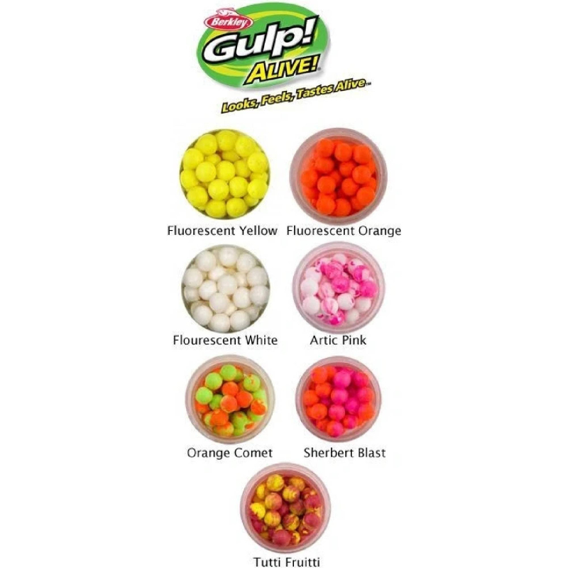 Nástraha Gulp! Alive Floating Salmon Eggs, která svým tvarem, chutí i vůní imituje rybí jikry je vítanou pochoutkou téměř všech rybích druhů, především při lovu pstruhů.