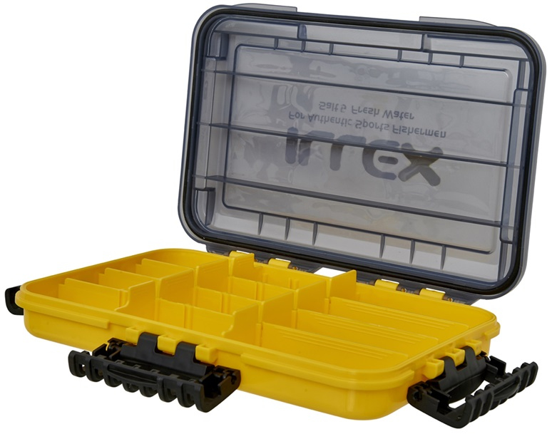 Vodotěsná krabička na nástrahy a drobnosti. Celkem obsahuje 12 nastavitelných přihrádek. Čtyři uzávěry s vodotěsnou úpravou víka zabraňují vniknutí vody do krabičky. Pokud není krabička naplněna těžkými věcmi, bude plavat na hladině při nečekaném pádu do vody.