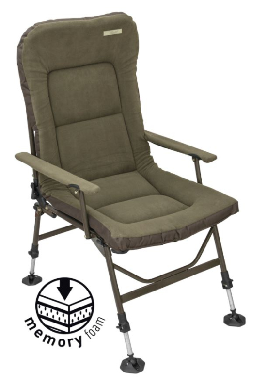 Pohodlné křeslo pevné konstrukce s loketními opěrkami. Sedací část s paměťovou pěnou je silně čalouněná. což oceníme zejména v chladnějším období, kdy nám zpříjemní pobyt u vody. Opěrka je polohovatelná a v jednotlivých polohách ji fixujeme dotažením ozubených spojů. Teleskopické, nastavitelné nohy umožňují stabilní nastavení v jakémkoliv nerovném terénu a široké patky brání boření do měkké půdy. Určené je pro ty co mají rádi více dní trvající rybačky a chtějí mít své pohodlí.