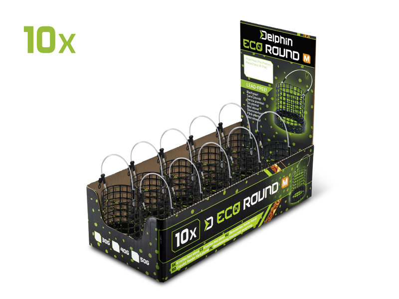 Samotný košík je vyhotoven z pevného drátu, který spolehlivě odolává náročným podmínkám a mechanickému poškození. Válcovitý tvar zajišťuje rychlé uvolnění krmné směsi ihned po dopadu na dno. Oproti klasickým krmítkům na daleké hody se „slzou“ na spodku nabízí model ECO ROUND rychlejší rozpad objemnějších částí krmiva. Stačí naplnit hrubou směs, zajistit ji z obou stran sypkým krmením a po dopadu na dno krmítkem jemně zatáhnout.