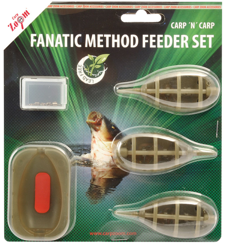 Kompletní sada pro method feeder rybaření. Tři in-line feederová krmítka s plochým dnem různých hmotností balené společně s formou pro správný tvar a třemi obratlíky. Krmítka a forma jsou k dispozici i samostatně.