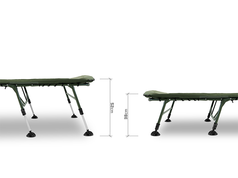 Lehátko je postaveno na pevné kovové konstrukci s vysokou nosností, která navzdory své odolnosti zůstává lehká a snadno přenosná. Na konstrukci se nachází osm výškově stavitelných nohou, které lze vysunout až do výšky 52 cm. Každá noha je vybavena širokou flexibilní patkou, která účinně zabraňuje zapadání do měkké půdy a zajišťuje stabilitu i na nerovném povrchu. Pár nohou pod hlavou je navíc opatřen zajišťovacím mechanismem, což usnadňuje rozložení lehátka a zároveň zabraňuje nechtěnému sklápění či posunu.
