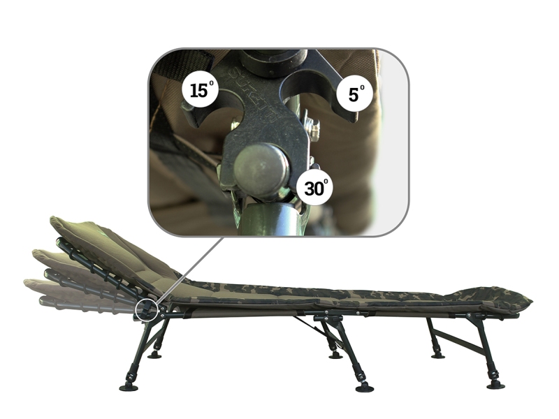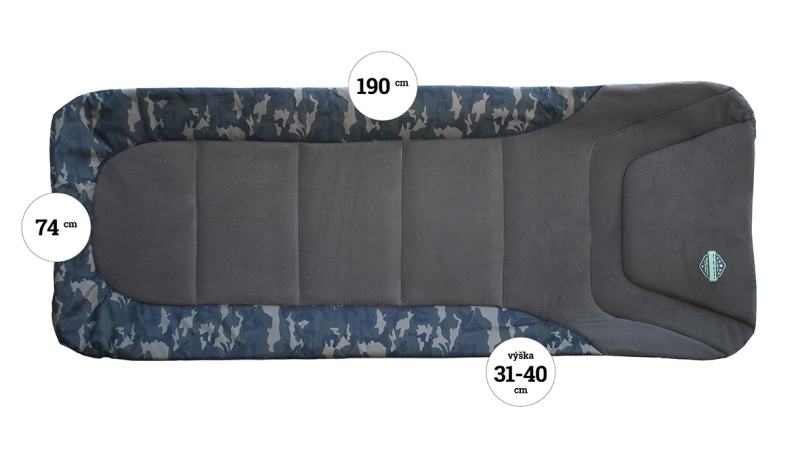 Lehátko Therapy Camo je šestinohé ploché lehátko bez kloubu se stabilitou osminohého lehátka. Unikátní rozložení tří párů noh umožňuje sezení po celé jeho délce. Nohy mají aretaci proti sklopení. Střed matrace je z mikro fleece, po obvodě Camo 600D Oxford a to celé vyplněno termoizolační pěnou. Matrace s polštářem je na konstrukci v prostřední části vyztužena pro větší pohodlí.