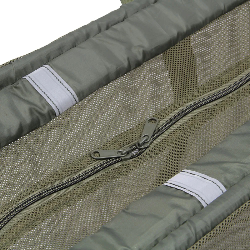 Jemná síťka šetrná k rybám umožňuje rychlý odtok vody a zároveň chrání rybu při manipulaci. Díky čtyřem úchytům lze sak snadno přenášet jednou nebo dvěma osobami, a reflexní pásky zajišťují viditelnost i za sníženého světla. Pro pohodlné vážení slouží dva pevné popruhy, a vše můžete snadno uložit do praktického přepravního pouzdra, které je součástí balení.