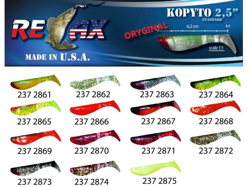 Jedna z nejznámějších a nejúčinnějších nástrah pro lov dravých ryb. Mohutné tělíčko s ocáskem, který dokonale pracuje a imituje rybku ve vodě. Vydává vibrace, které jsou pro dravce v okolí neodolatelné. Oblíbené nástrahy ověřené časem a řadou spokojených rybářů po celém světě. RELAX kopyto je dostupné v množství barevných provedeních s flitry nebo i jako čistá barevná guma. Přírodní barvy zaručí úspěch v čisté vodě, naopak zářivé budou úspěšné v hluboké nebo kalné vodě.