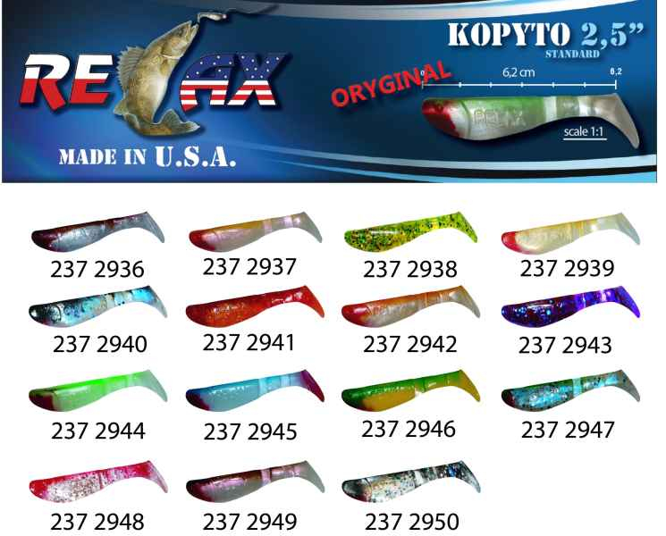 Jedna z nejznámějších a nejúčinnějších nástrah pro lov dravých ryb. Mohutné tělíčko s ocáskem, který dokonale pracuje a imituje rybku ve vodě. Vydává vibrace, které jsou pro dravce v okolí neodolatelné. Oblíbené nástrahy ověřené časem a řadou spokojených rybářů po celém světě. RELAX kopyto je dostupné v množství barevných provedeních s flitry nebo i jako čistá barevná guma. Přírodní barvy zaručí úspěch v čisté vodě, naopak zářivé budou úspěšné v hluboké nebo kalné vodě.