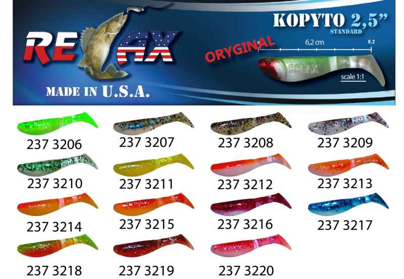 Jedna z nejznámějších a nejúčinnějších nástrah pro lov dravých ryb. Mohutné tělíčko s ocáskem, který dokonale pracuje a imituje rybku ve vodě. Vydává vibrace, které jsou pro dravce v okolí neodolatelné. Oblíbené nástrahy ověřené časem a řadou spokojených rybářů po celém světě. RELAX kopyto je dostupné v množství barevných provedeních s flitry nebo i jako čistá barevná guma. Přírodní barvy zaručí úspěch v čisté vodě, naopak zářivé budou úspěšné v hluboké nebo kalné vodě.