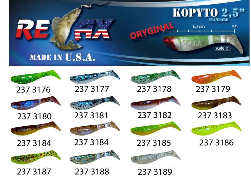 Jedna z nejznámějších a nejúčinnějších nástrah pro lov dravých ryb. Mohutné tělíčko s ocáskem, který dokonale pracuje a imituje rybku ve vodě. Vydává vibrace, které jsou pro dravce v okolí neodolatelné. Oblíbené nástrahy ověřené časem a řadou spokojených rybářů po celém světě. RELAX kopyto je dostupné v množství barevných provedeních s flitry nebo i jako čistá barevná guma. Přírodní barvy zaručí úspěch v čisté vodě, naopak zářivé budou úspěšné v hluboké nebo kalné vodě.
