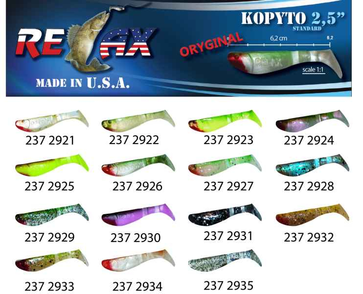 Jedna z nejznámějších a nejúčinnějších nástrah pro lov dravých ryb. Mohutné tělíčko s ocáskem, který dokonale pracuje a imituje rybku ve vodě. Vydává vibrace, které jsou pro dravce v okolí neodolatelné. Oblíbené nástrahy ověřené časem a řadou spokojených rybářů po celém světě. RELAX kopyto je dostupné v množství barevných provedeních s flitry nebo i jako čistá barevná guma. Přírodní barvy zaručí úspěch v čisté vodě, naopak zářivé budou úspěšné v hluboké nebo kalné vodě.