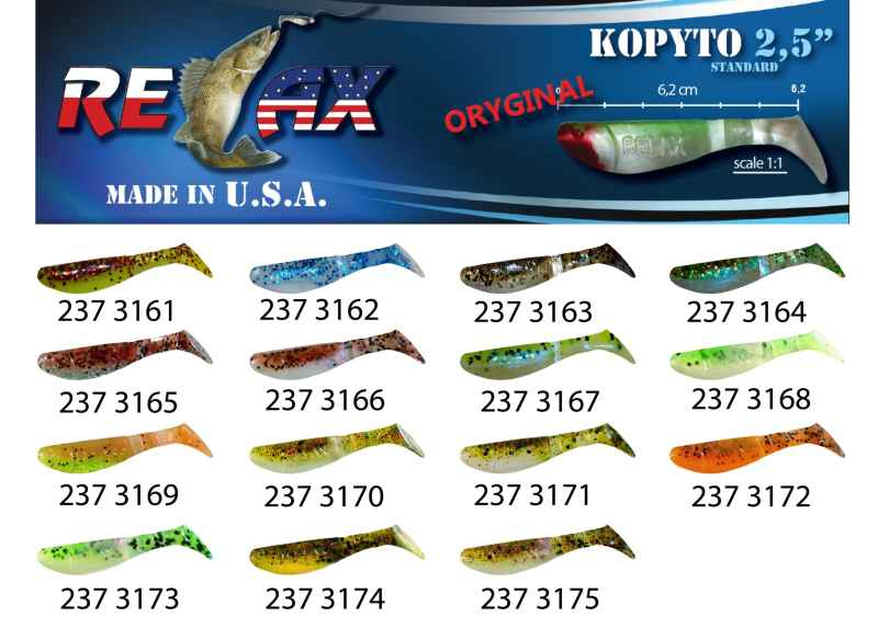 Jedna z nejznámějších a nejúčinnějších nástrah pro lov dravých ryb. Mohutné tělíčko s ocáskem, který dokonale pracuje a imituje rybku ve vodě. Vydává vibrace, které jsou pro dravce v okolí neodolatelné. Oblíbené nástrahy ověřené časem a řadou spokojených rybářů po celém světě. RELAX kopyto je dostupné v množství barevných provedeních s flitry nebo i jako čistá barevná guma. Přírodní barvy zaručí úspěch v čisté vodě, naopak zářivé budou úspěšné v hluboké nebo kalné vodě.