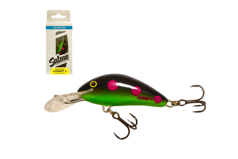 Od kdy existuje řada Salmo, od té doby je nejprodávanější a nejoblíbenější typem Hornet. Rozměrově není velký, avšak přeci s ním dokážeme lovit výjimečně úspěšně. Velmi starostlivě se vyrábí, velká preciznost je potřebná k tomu, abychom navzdory malým rozměrům dokázali vést velkou rychlostí bez toho, aby se vychýlila z linie trasy. Navzdory malé hmotnosti se s adekvátní výbavou velmi dobře nahazuje. V pěti rozměrech, s třemi usměrňovacími disky, ve vypracování plovoucích, klesajících a do hloubky potápivých, Druhy ryb: pstruh, okoun, štika, bolen, jelec Speciální místa, situace: Ve všeobecnosti asi nejlepší použitelný typ této řady.Základní parametry:
