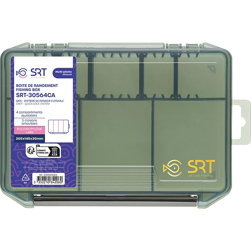Nastavitelné rybářské boxy se 4 přihrádkami v šedé barvě, vyrobené z polypropylenu a ABS plastu, jsou speciálně navrženy tak, aby poskytovaly praktické a diskrétní úložiště vašeho rybářského příslušenství.