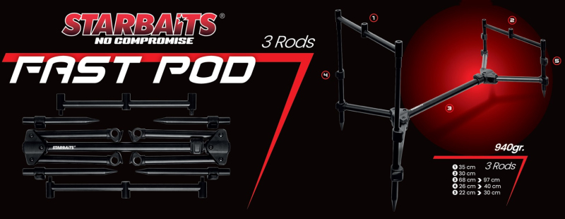 Ultimátní lehký a super sbalitelný stojan na tři pruty pro rychlé výpravy za kapry. Jeho předností je minimalistický a elegantní design, minimální rozměry při sbalení, snadné sestavení a konstrukce z ultra lehké, ale pevné aluminiové letecké slitiny. Jednoduchý černý matný design. Výškově nastavitelné nohy a hrazdy. Rozměry: 54x22 cm, délka 68-98 cm, výška přední 26-40 cm, výška zadní 22-32 cm, hrazdy 38 a 32 cm, váha 940 g.