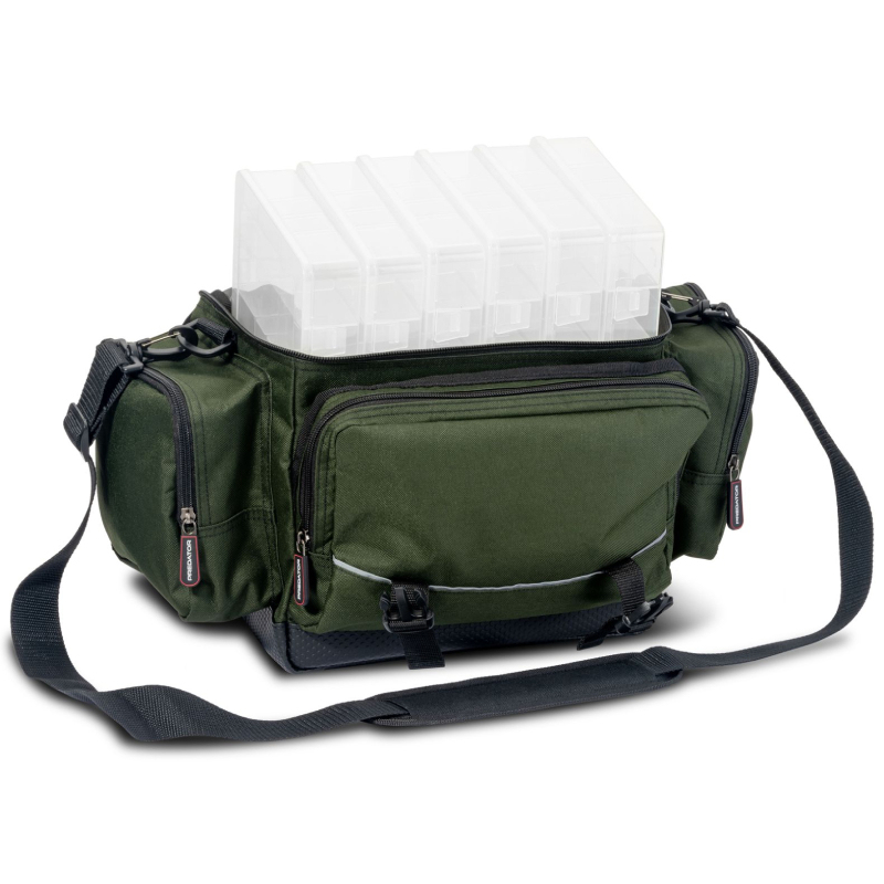 Tato mimořádně prostorná a robustní taška je ideální pro dlouhé dny u vody i rybaření z lodě. Hlavní komora poskytuje obrovský prostor až pro šest boxů, které jsou součástí balení. Přední kapsa, dvě boční kapsy a plochá kapsa na dokumenty udržují perfektní pořádek. Polstrovaný ramenní popruh a pevné madlo zajišťují pohodlný transport, zatímco pogumované dno chrání vybavení před vodou a nečistotami.
