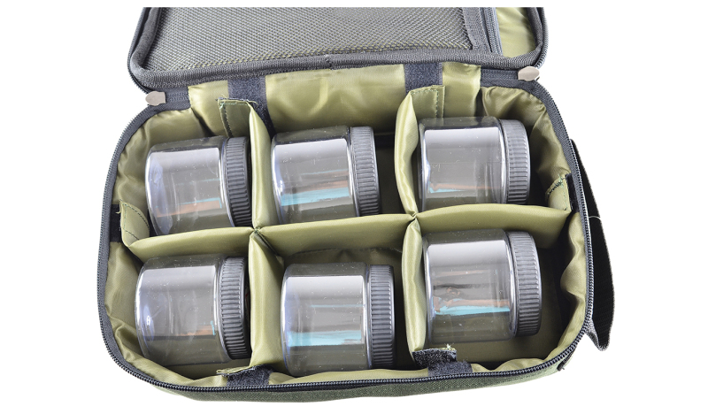 Taška se šesti přihrádkami a plastovými dózami na uchování a bezpečnou přepravu dipů. Více zde