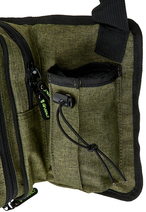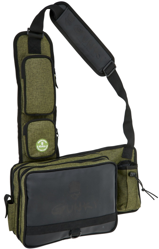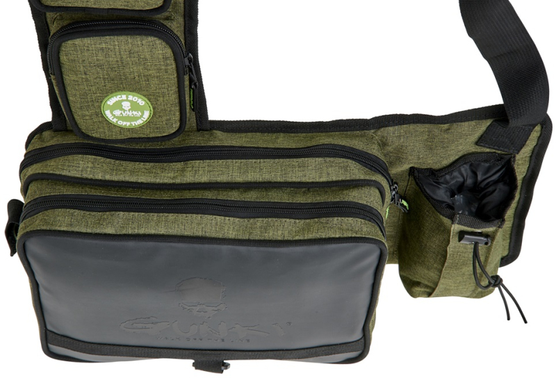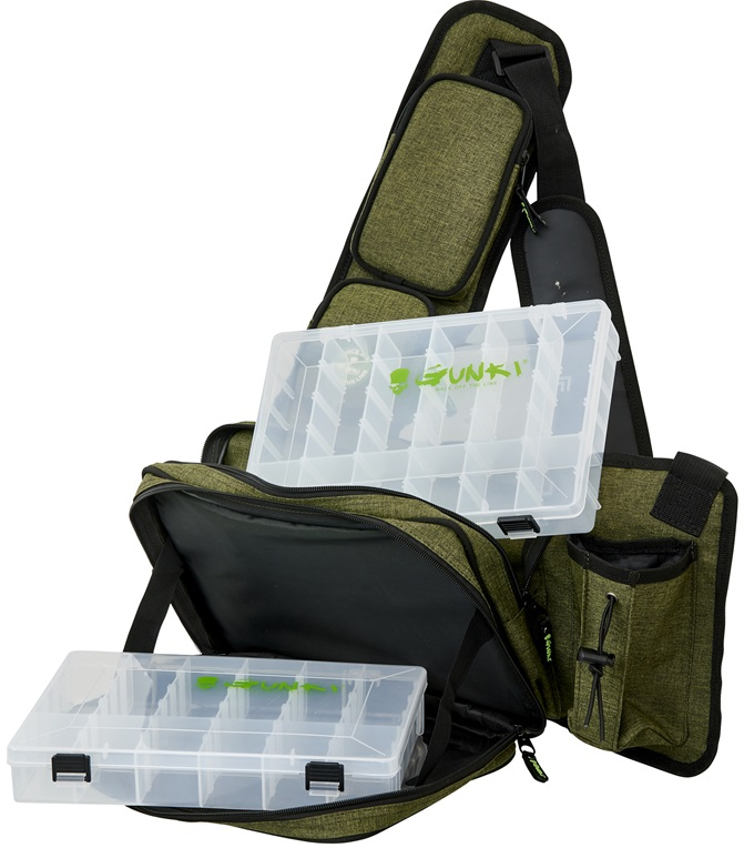 Lehký batůžek přes jedno rameno s nastavitelným polstrovaným popruhem pro rychlé vláčecí vycházky. Obsahuje dvě hlavní komory na zip, dvě menší kapsy na zip, držák kleští a kapsu na pití. Součástí je i D kroužek na další vybavení. Součástí jsou i dvě krabičky na nástrahy 27,5x19,5x45 cm. Pevná odolná tkanina je doplněná o kvalitní zipy. To vše v Gunki designu. Rozměr: 45x22x10 cm.