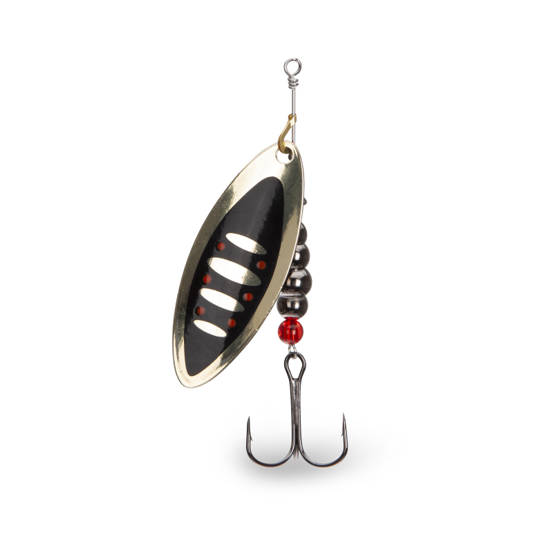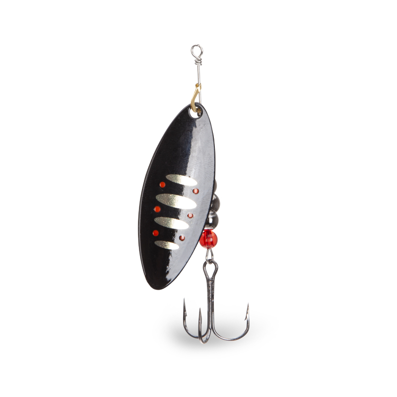 Klasická rotační třpytka s podlouhlým listem. Je vyrobena z kvalitního materiálu a doplněna kvalitními komponenty. Je osazena háčky Mustad. Lopatka má z každé strany jiný design.