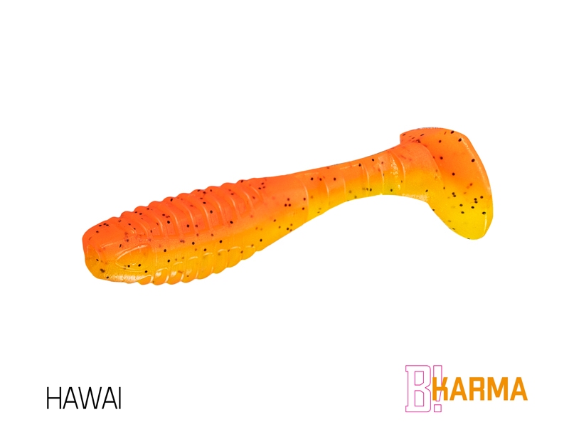 Design modelu KARMA jsme od počátku brali jako neklasické řešení klasického modelu. Cílem bylo vytvořit nástrahu se širokým záběrem použití, ale po našem. Již při prvním pohledu si můžete všimnout, že poměr velikosti těla k ocasu nástrahy je odlišný od běžného. Větší ocas nástrahy zapříčiňuje atypický pohyb nástrahy, který kromě kmitání ocasu přidává i jemné převalování tělíčka, což vytváří dojem zranitelného jedince. Tento pohyb je pro ryby nesmírně atraktivní a přináší vám nové možnosti v práci s nástrahou. Mezi spojením těla nástrahy a ocasu jsou vymodelovány tři zářezy, které dodávají chodu nástrahy uvěřitelnost. Samotné tělo nástrahy je na zádech a břiše opatřeno vroubkováním. Má to dva důvody. Prvním je zvětšení vibrací ve vodě. Druhým důvodem je usnadnění nastražení nástrahy na háček. Pomocí zářezů si můžete přesně vyměřit, kde bude háček z nástrahy vycházet. Proporční napíchnutí jigu je pak jednoduché. Přední část nástrahy v oblasti tlamy je upravena výřezem kvůli lepšímu dosednutí nástrahy k jigové hlavičce.