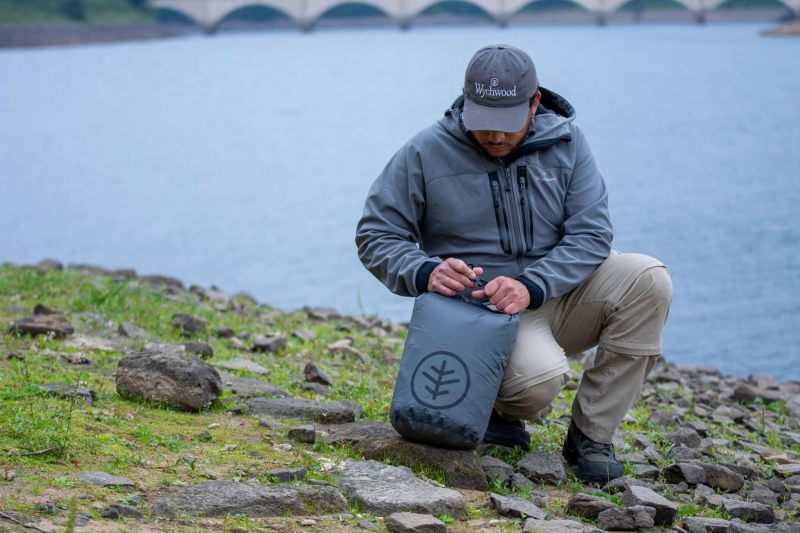 Použitím materiálem je RipStop PVC 210T o šířce stěny 0,23mm. Vak se pak jednoduše uzavře zamotáním vrchní části a uzamčením díky odolnému plastovému klipu, ten je navíc zesílen nylonovým popruhem. Vak obsahuje výrazné černé logo Wychwood v přední části. Barva vaku je šedá.