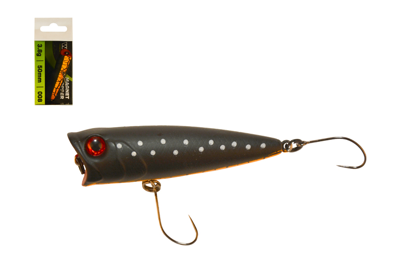 Hladinový popper Magnet je určen k lovu v oblastech, kde jsou trojháčky zakázány. Díky unikátnímu tvaru tlamy dokáže šplouchat hodně vody, což vytváří klasický „pop“ zvuk, který je smrtelný pro pstruhy a black bassa, plus samozřejmě bolení.